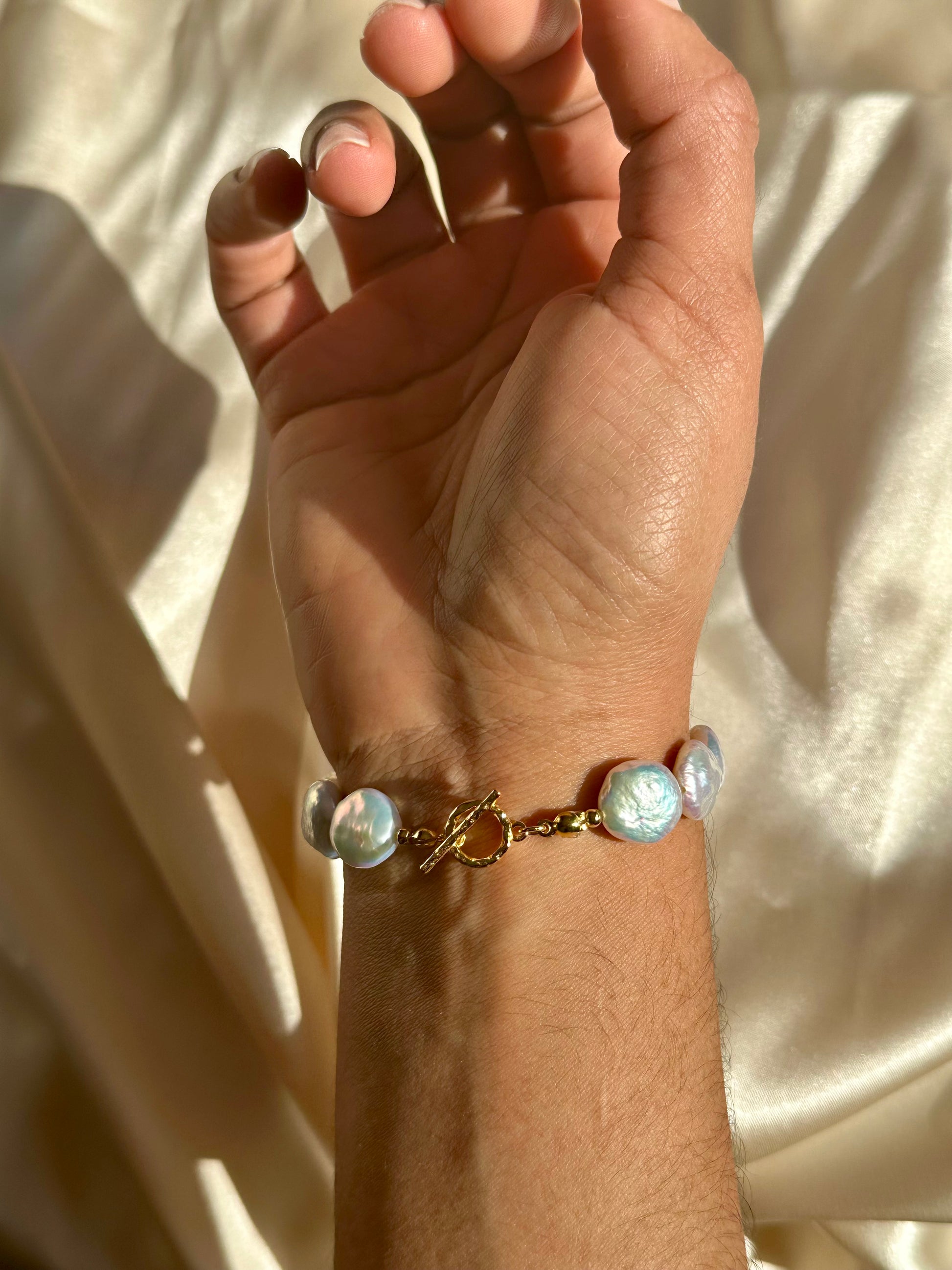 Entre cada perla se incorporan pequeños separadores dorados, que no dominan la pieza, pero sí añaden un toque cálido y elegante. El cierre tipo toggle dorado funciona como parte del diseño, no solo como un mecanismo: es visible, sólido y estéticamente coherente con la pulsera.